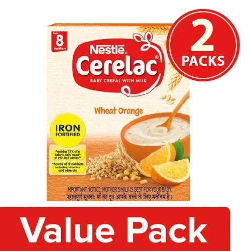 Nestle Cerelac Fortified Baby Cereal with Milk, Wheat Orange is a complementary food for babies from 8 months onwards. While infants and children have higher requirements of nutrients than adults, 2 serve of Cerelac Wheat Orange Cereal provides 75% of a baby’s daily need of iron. Also a source of 19 important nutrients including vitamins and minerals, Cerelac Wheat Orange Cereal is free from added colours, flavours and preservatives.